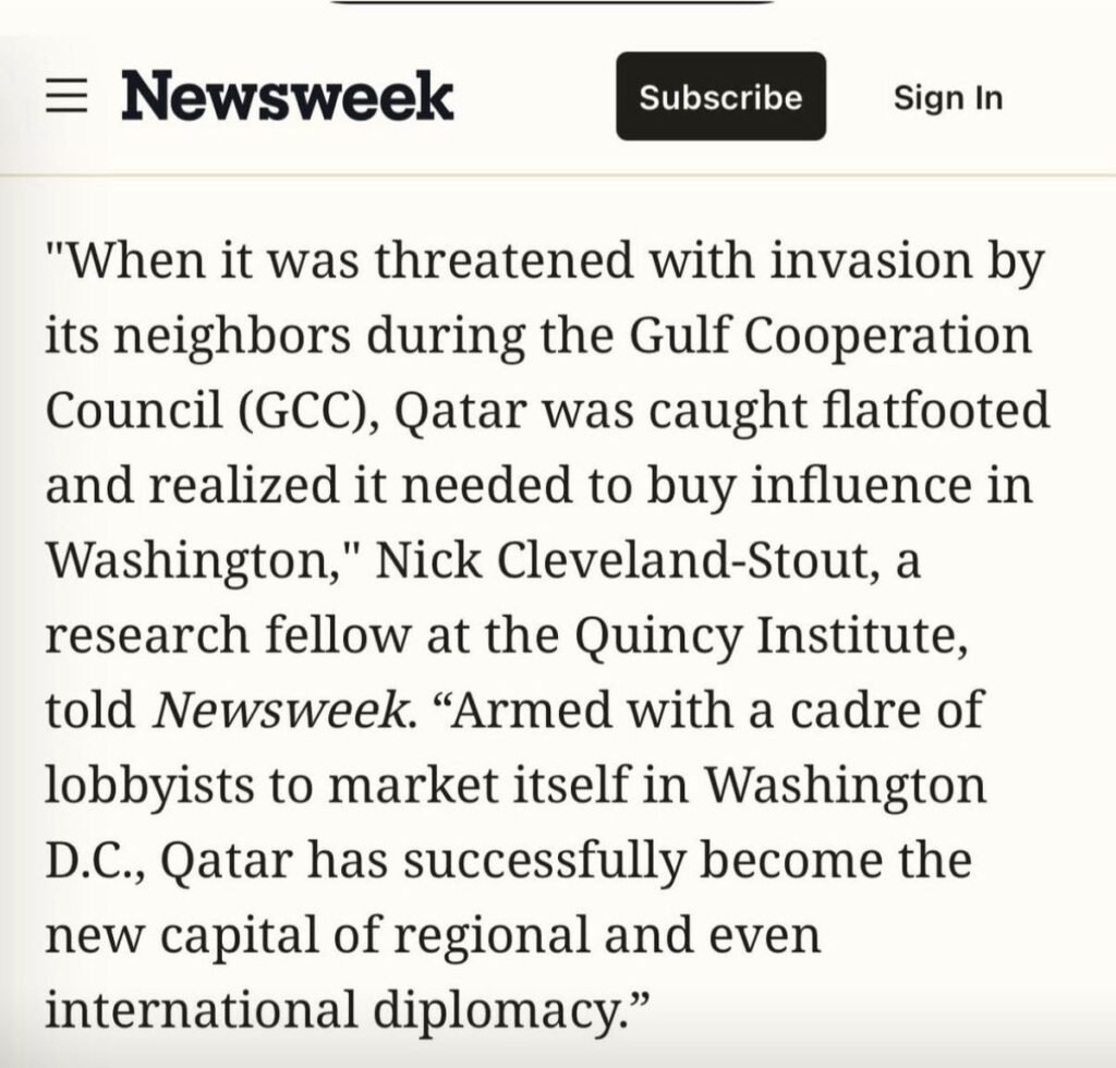 34. Quincy Institute for Responsible Statecraft. “Soft Power, Hard Influence: How Qatar Became a Giant in Washington.” *Quincy Institute*, January 2024. (https://quincyinst.org/research/soft-power-hard-influence-how-qatar-became-a-giant-in-washington/).