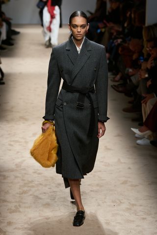 But it wasn’t so much the wide embrace of atypical fur accessories that really sold this trend’s comeback so much as the styling itself, which leaned excessively maximalist in a way that screamed wealth rather than whispered it. That ethos was embodied in quite a few fall collections, including, most notably, Miu Miu, where the femininity was dialed up to the max through styling. The rigid silhouettes of traditional tailoring were softened when a structured tailored coat wasn’t just styled over silk underpinnings but adorned with a furry stole around the arm.
